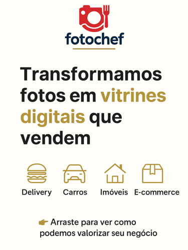 Se você quer vender mais no iFood, destacar seu carro ou imóvel, aumentar as vendas do seu e-commerce ou até ter um ensaio fotográfico com IA, a FotoChef transforma suas fotos em vitrines digitais que atraem e convertem.